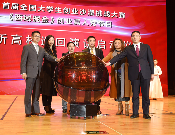 仪式上,李朝平、陈逸、贝淑芳、姜一萍、张仰飞、刘振鹏、江永胜等领导共同按动启动球,伴随着全场热烈的掌声,2016《西域掘金》创业真人秀节目全国百所高校巡回演讲正式启动。
