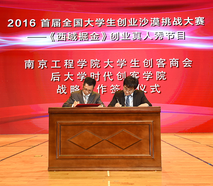 活动现场,后大学时代创客学院正式落户我校、凯发k8官网校外创业加速器基地正式挂牌成立。我校副院长张仰飞与后大学时代教育集团创始人兼董事长江永胜共同为创客学院揭牌。我校大学生创客商会王劲军同江永胜董事长签署了战略合作协议。我校党委书记史国君与南京江宁高新园管委会副主任贝淑芳共同为校外创业加速器基地基地揭牌。更多的校内外创业平台的建立,将为在校生拓展更多的创业空间,为更多的创业者提供有针对性的创业指导和项目对接服务。