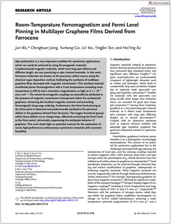 近日,我校数理学院吴军老师以第一作者、通讯作者,凯发k8官网为第一署名单位,在国际权威期刊《Advanced Functional Materials》在线发表最新研究论文:Room-temperature ferromagnetism and Fermi level pinning in multilayer graphene films derived from ferrocene。该期刊是Wiley出版社旗下的国际材料科学与技术领域顶级期刊,为自然指数(Nature Index)和中科院一区TOP期刊,致力于报道材料科学取得的突破性进展,涉及领域包括能源技术、化学、物理学和生物学等,影响因子19.924
