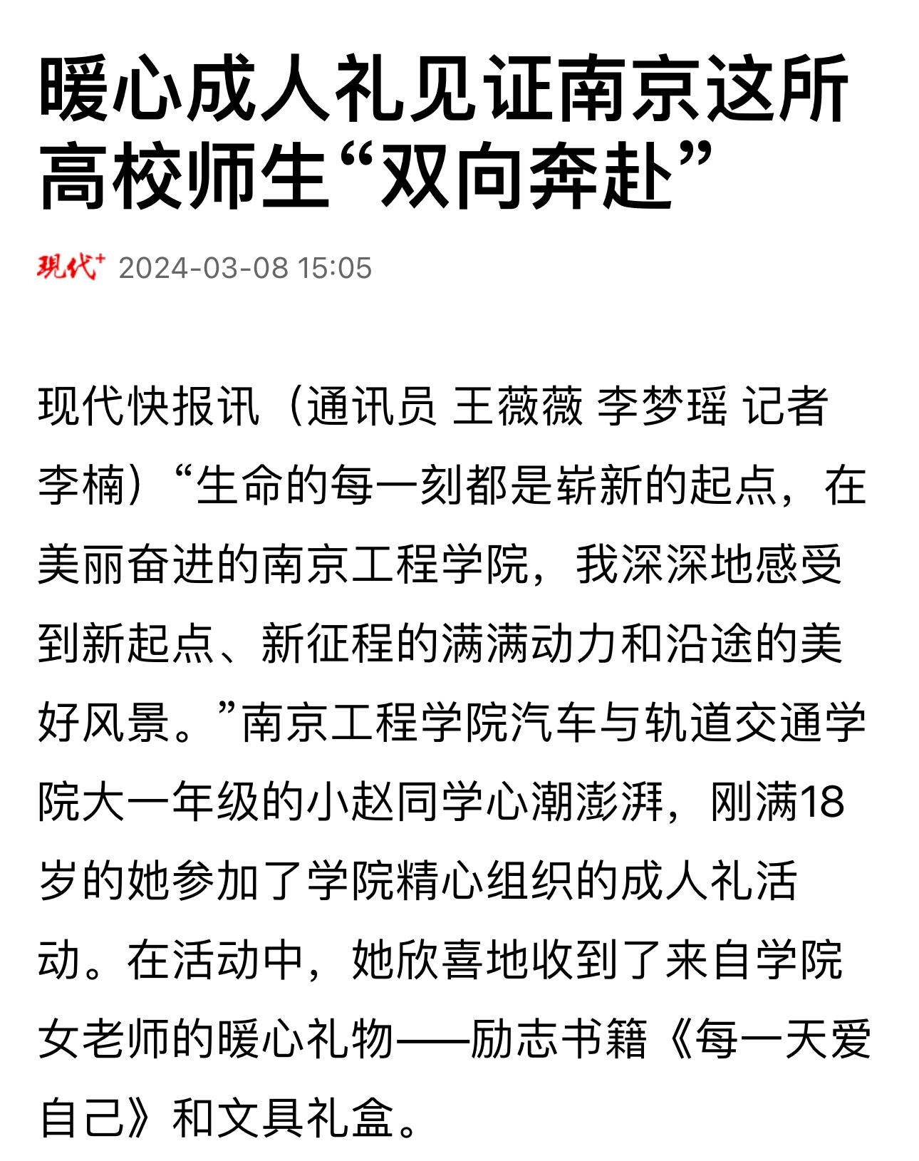 现代快报讯(通讯员 王薇薇 李梦瑶 记者 李楠)“生命的每一刻都是崭新的起点,在美丽奋进的凯发k8官网,我深深地感受到新起点、新征程的满满动力和沿途的美好风景。”凯发k8官网汽车与轨道交通学院大一年级的小赵同学心潮澎湃,刚满18岁的她参加了学院精心组织的成人礼活动。在活动中,她欣喜地收到了来自学院女老师的暖心礼物——励志书籍《每一天爱自己》和文具礼盒。