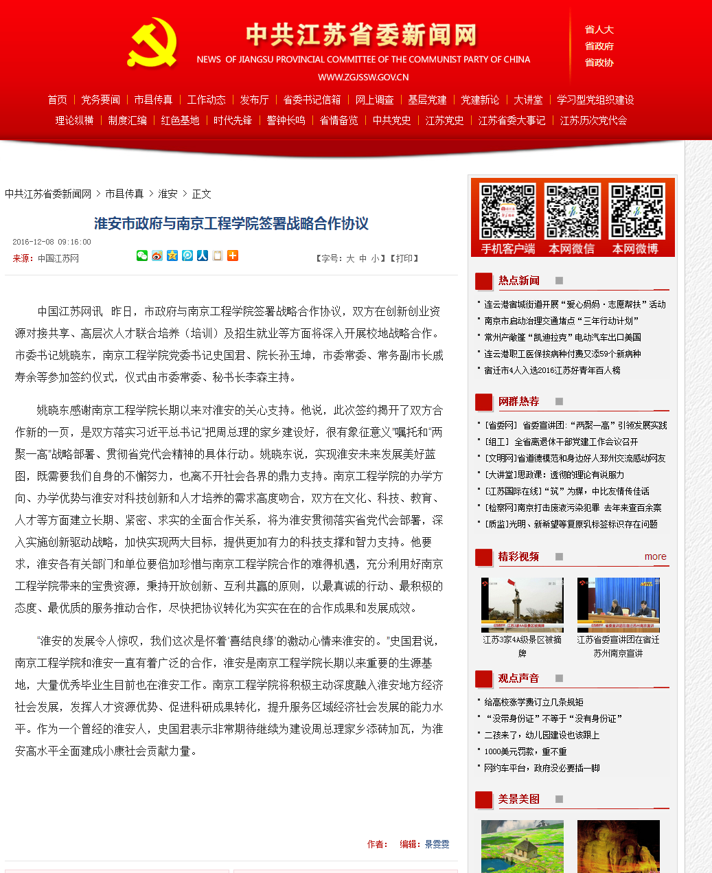 中国江苏网:《淮安市政府与凯发k8官网签署战略合作协议?》