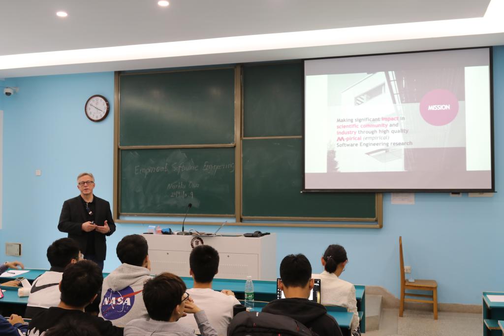 马库·欧依福教授首先向同学们介绍了经验软件工程的概念,并围绕经验软件工程中的各类研究项目,快速软件开发中最先进的需求工程,以及汽车软件工程等与该院学生展开了深入探讨。欧依福教授在讲座中指出“未来的世界将会是由软件所掌控的世界”,未来的汽车创新方面大约80%来自于软件,软件业将成为企业竞争中最有利的武器。